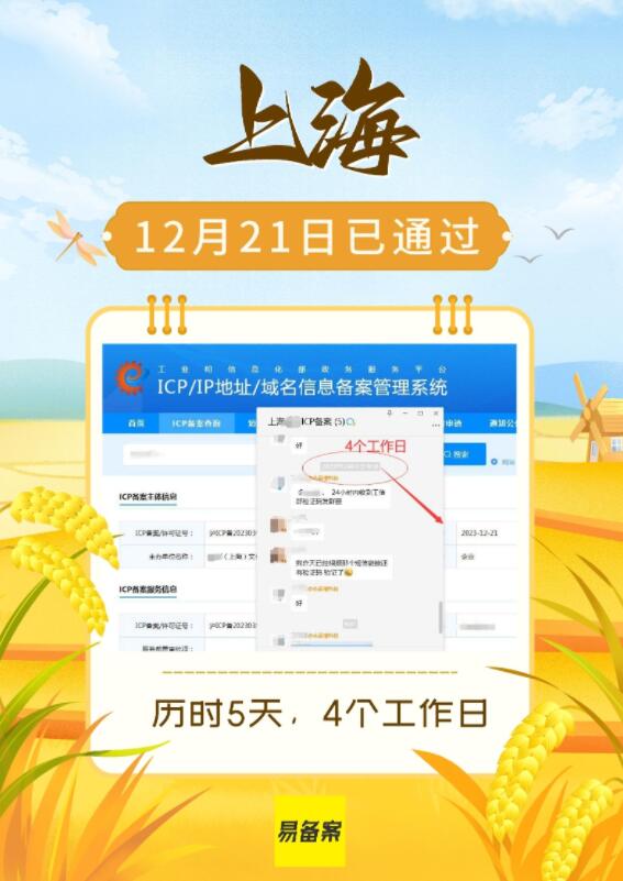 這是易備案做的一個(gè)上海客戶ICP代辦,只需要4個(gè)工作日,高效!因?yàn)闋可娴绞侵芰峤坏模缘戎芤还芫帜抢锊砰_始計(jì)時(shí)。正確的應(yīng)該是跨4個(gè)工作日,算是3個(gè)工作日完成的。